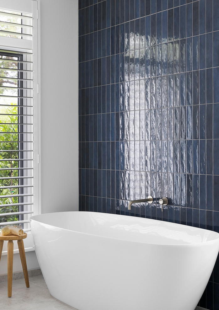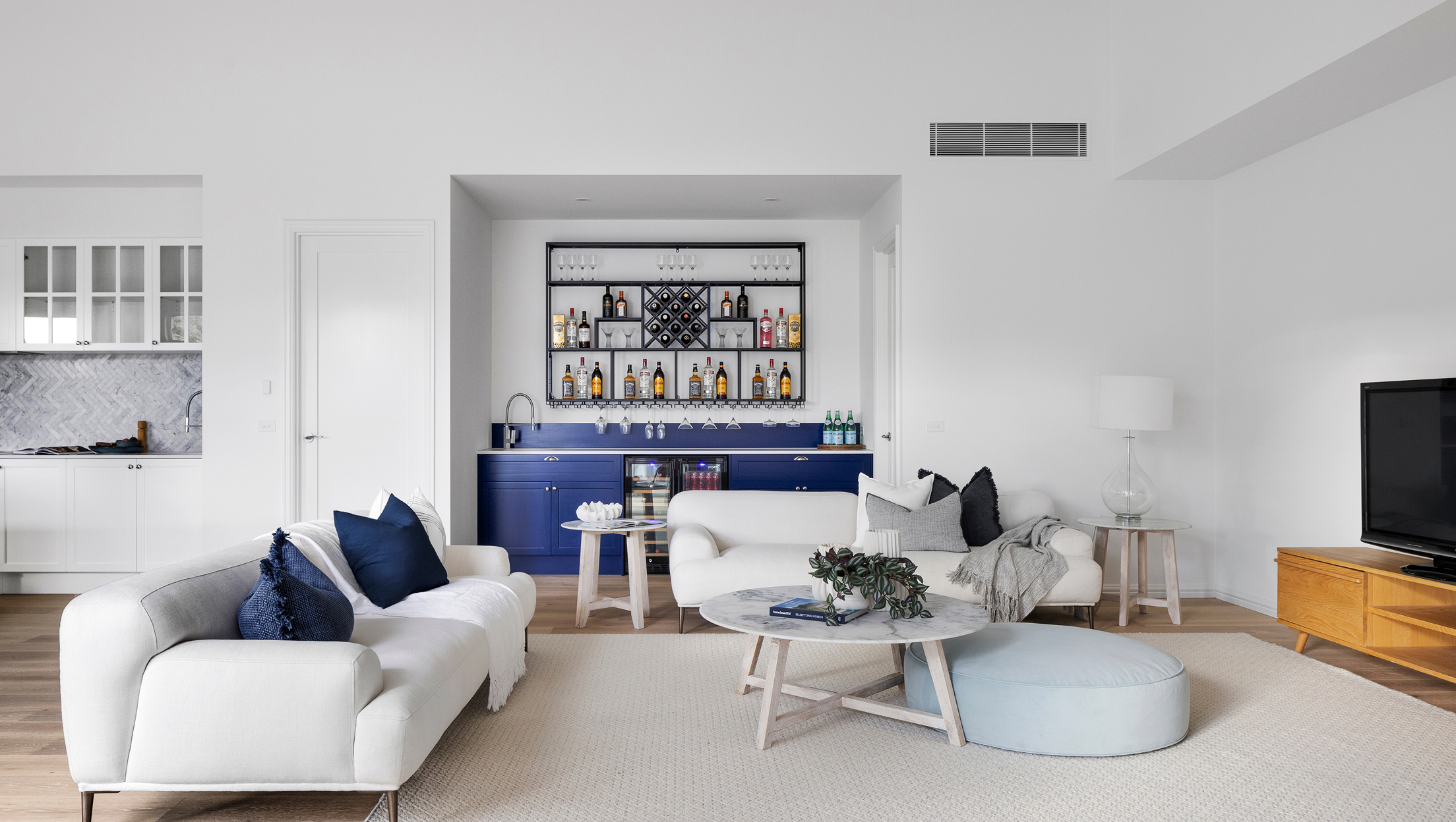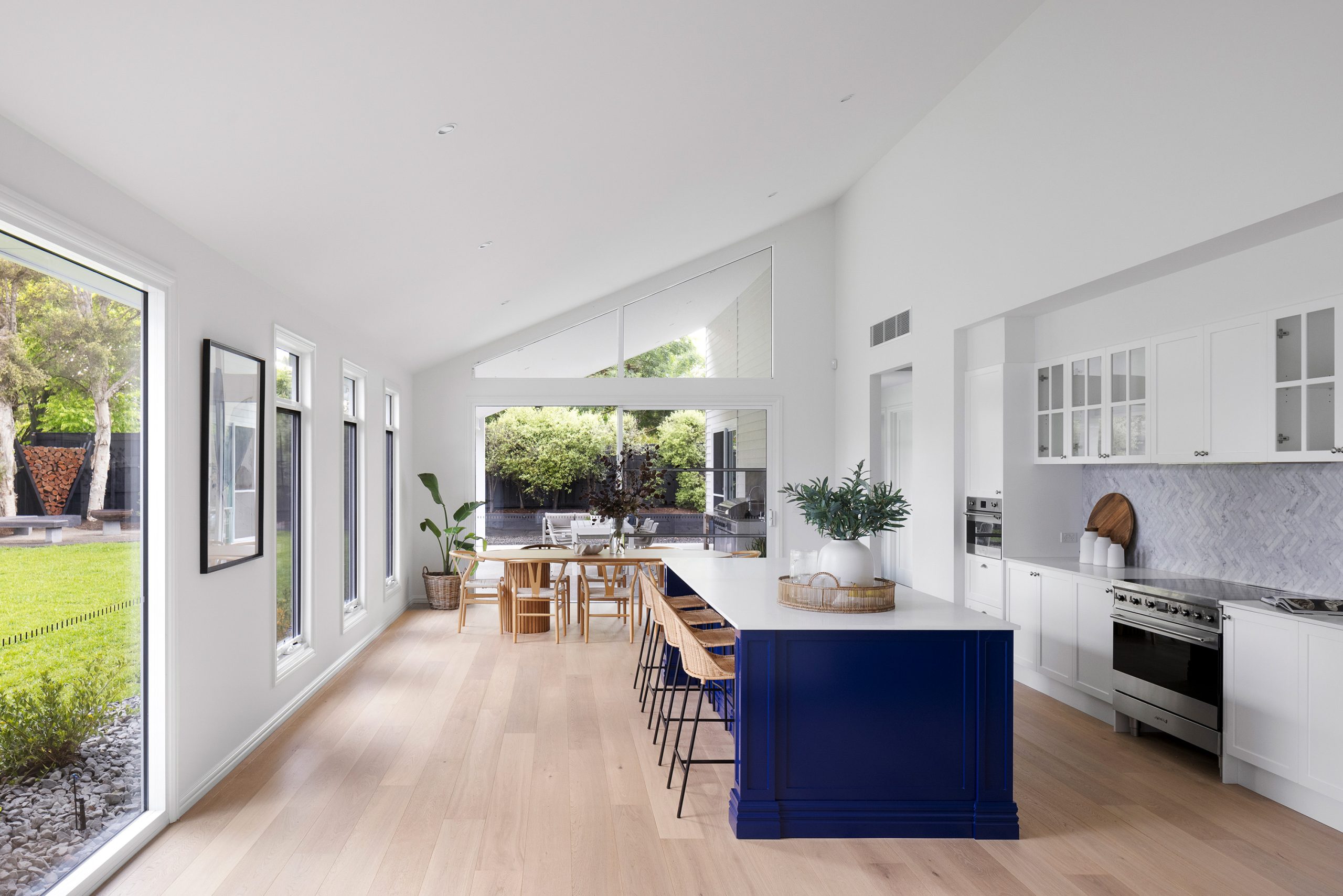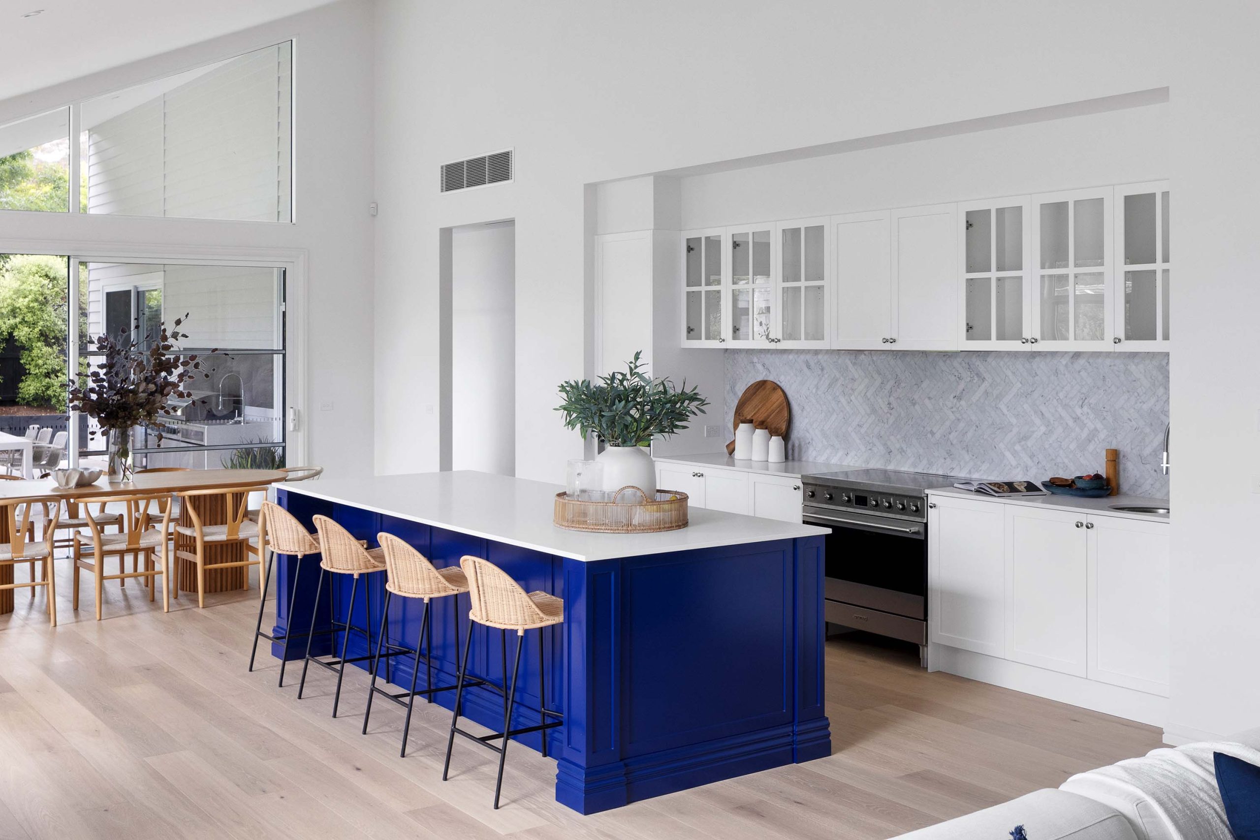 A striking blue island bench adds a bold yet sophisticated focal point. Its rich colour anchors the room and provides the perfect contrast to the crisp white surrounds, offering warmth, depth and personality without overpowering the space.
